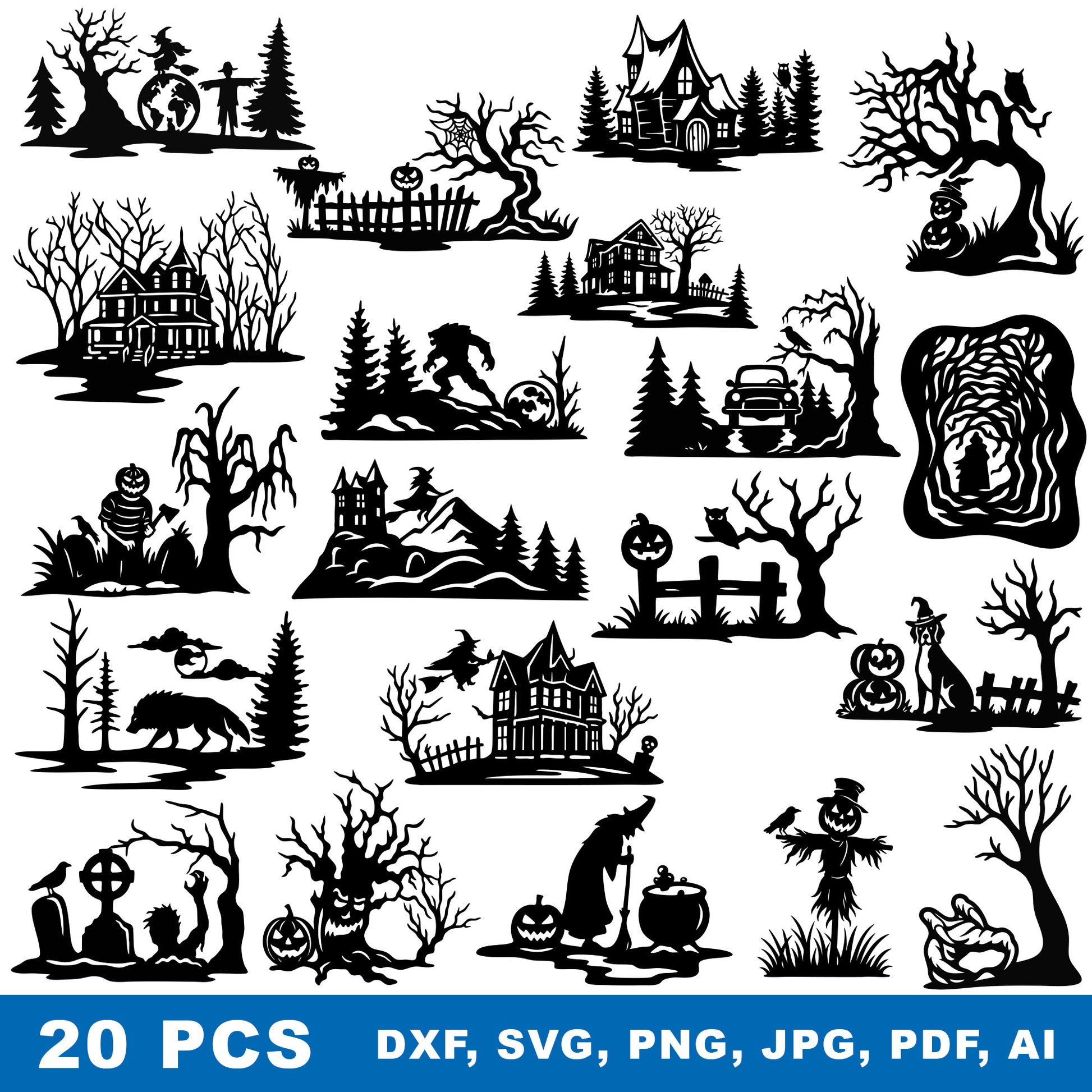 20 pcs halloween dxf bundle for cnc cutting design – spooky halloween scenes for laser projects; plasma-ready vector, high-quality cnc cut design