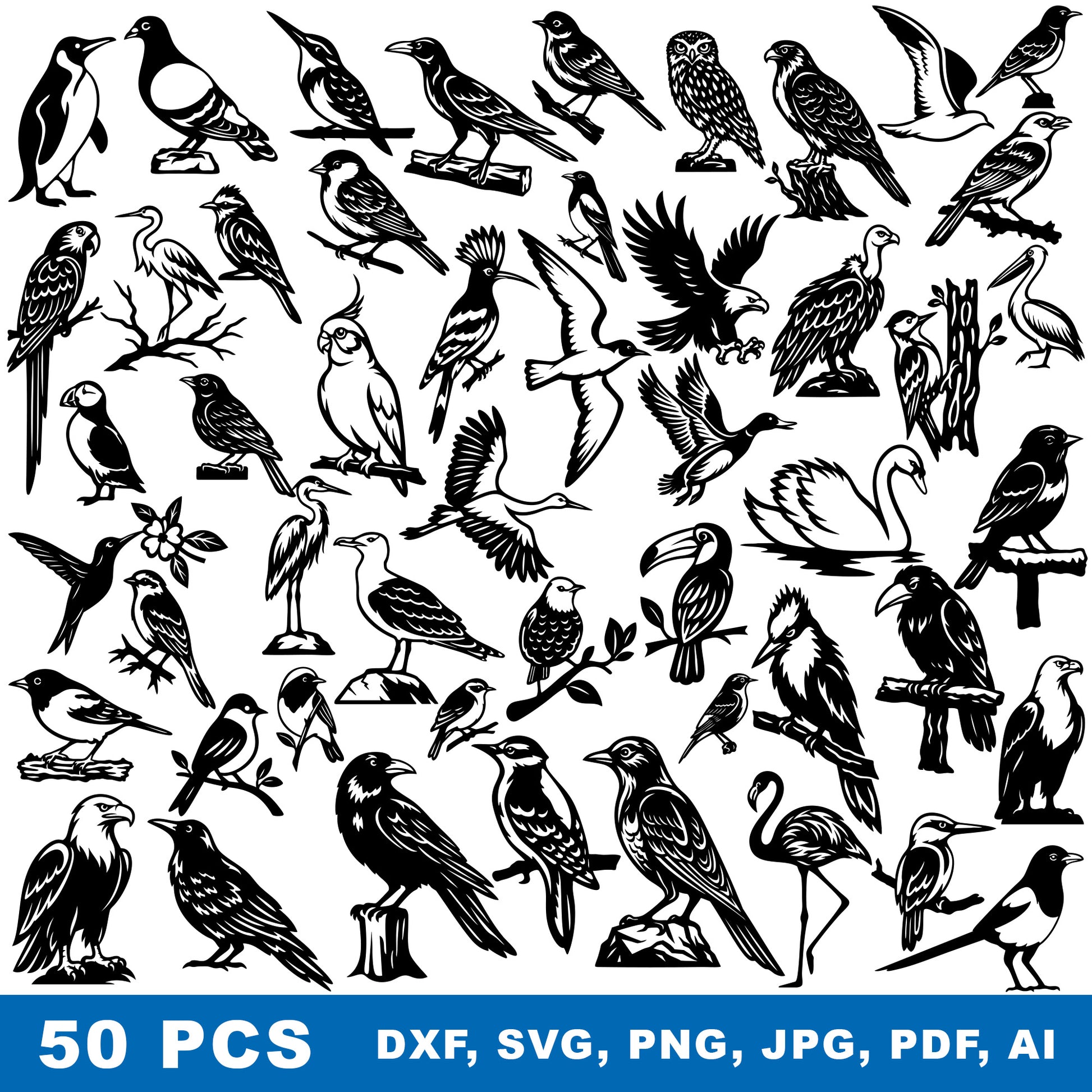 50 pcs bird DXF bundle for CNC cutting design – outlines for laser and plasma projects; multi-format vectors CNC cut design instant download